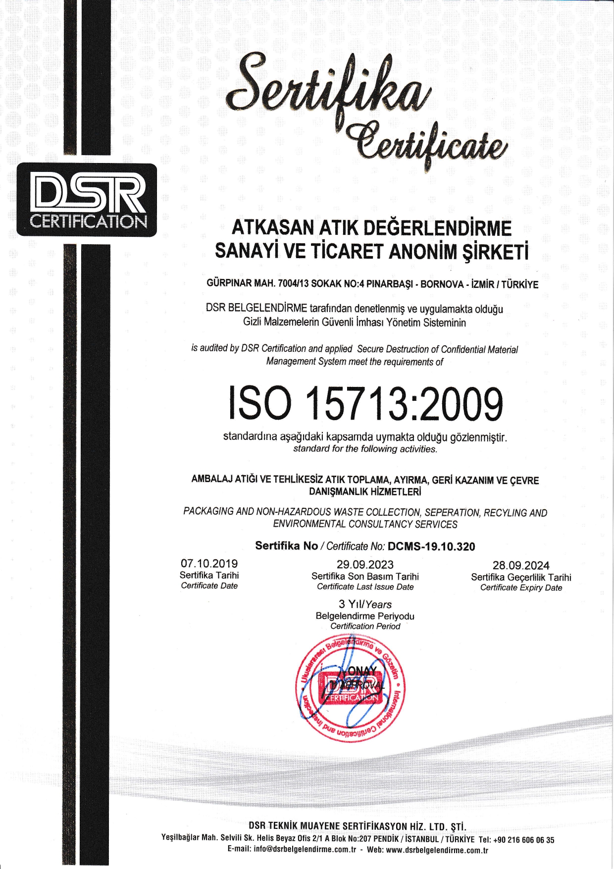 The purpose of the certificate TS EN 15713:2009 SAFE DISPOSAL OF HIDDEN MATERIAL owned by ATKASAN is to guarantee the safe, secure disposal of archival documents based on the principle of confidentiality.