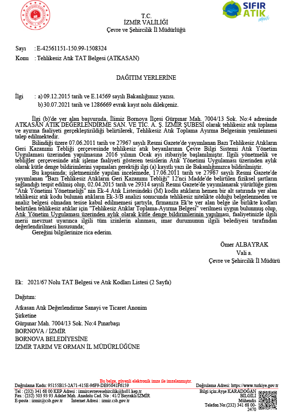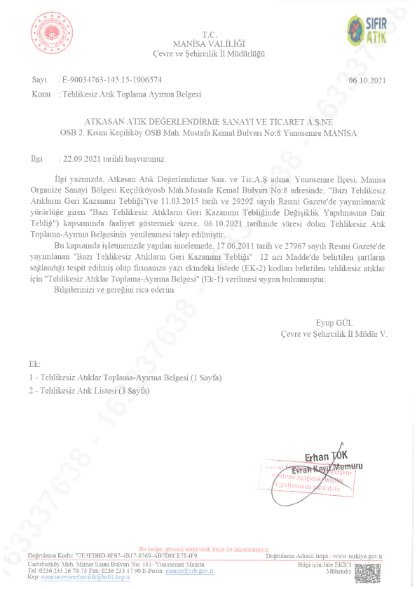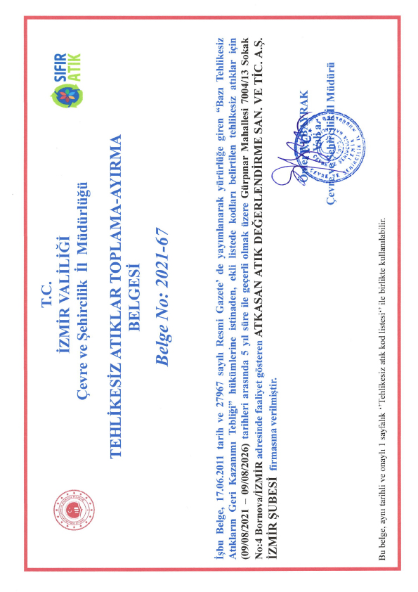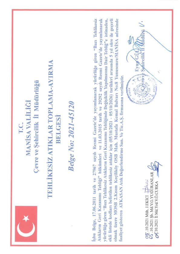 You can inquire about the validity of the Environmental License Certificate on Packaging Waste Collection and Separation of our authorized company from the Ministry of Environment, Urbanization and Climate Change on the website of the ministry or you can contact us.
